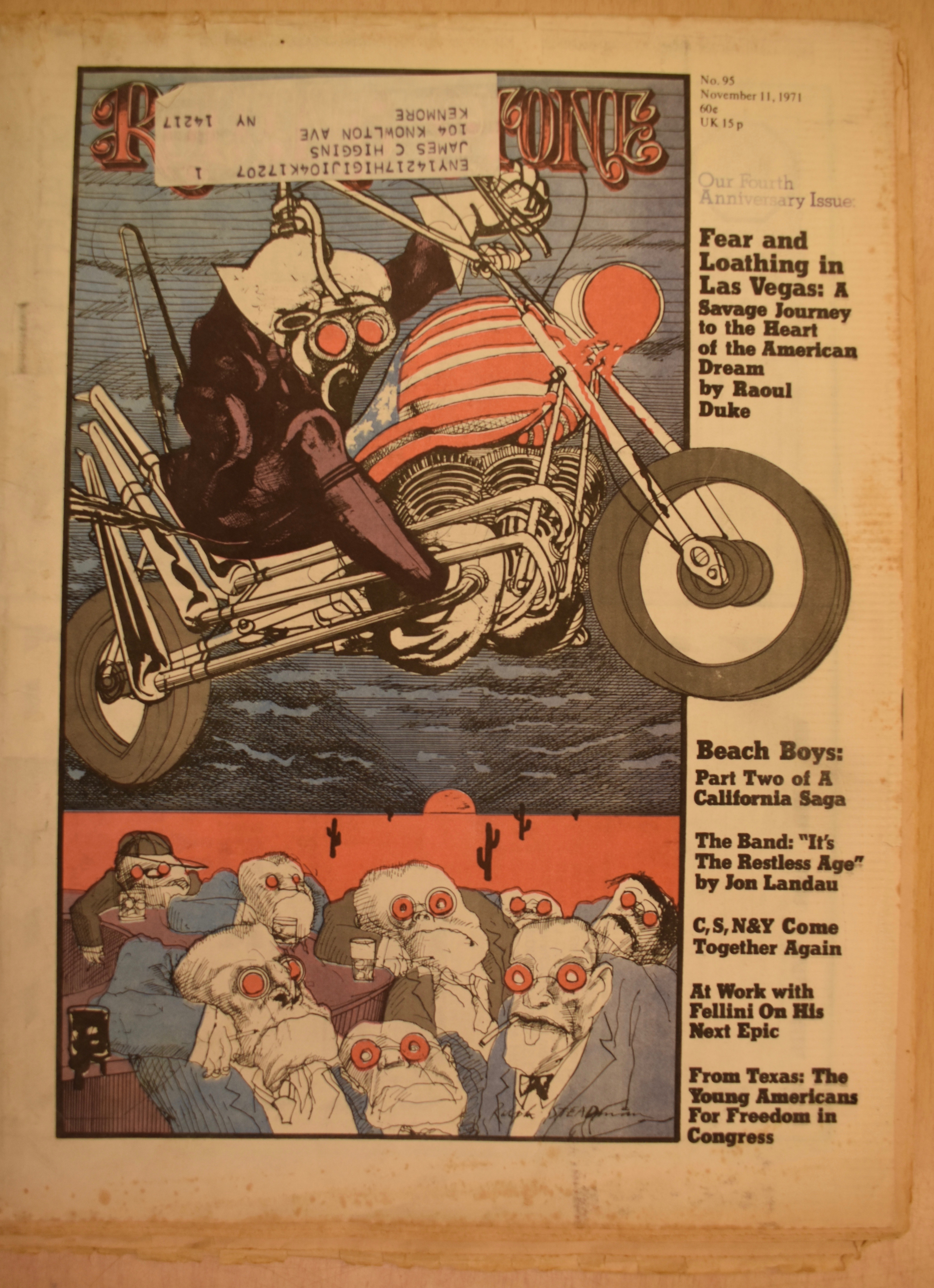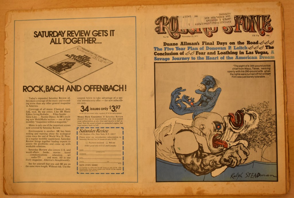 The first installment of Fear and Loathing in Las Vegas, complete with Ralph Steadman’s artwork and a prefatory “Letter From The Editor” by Jann Wenner, is published on 11 November 1971.