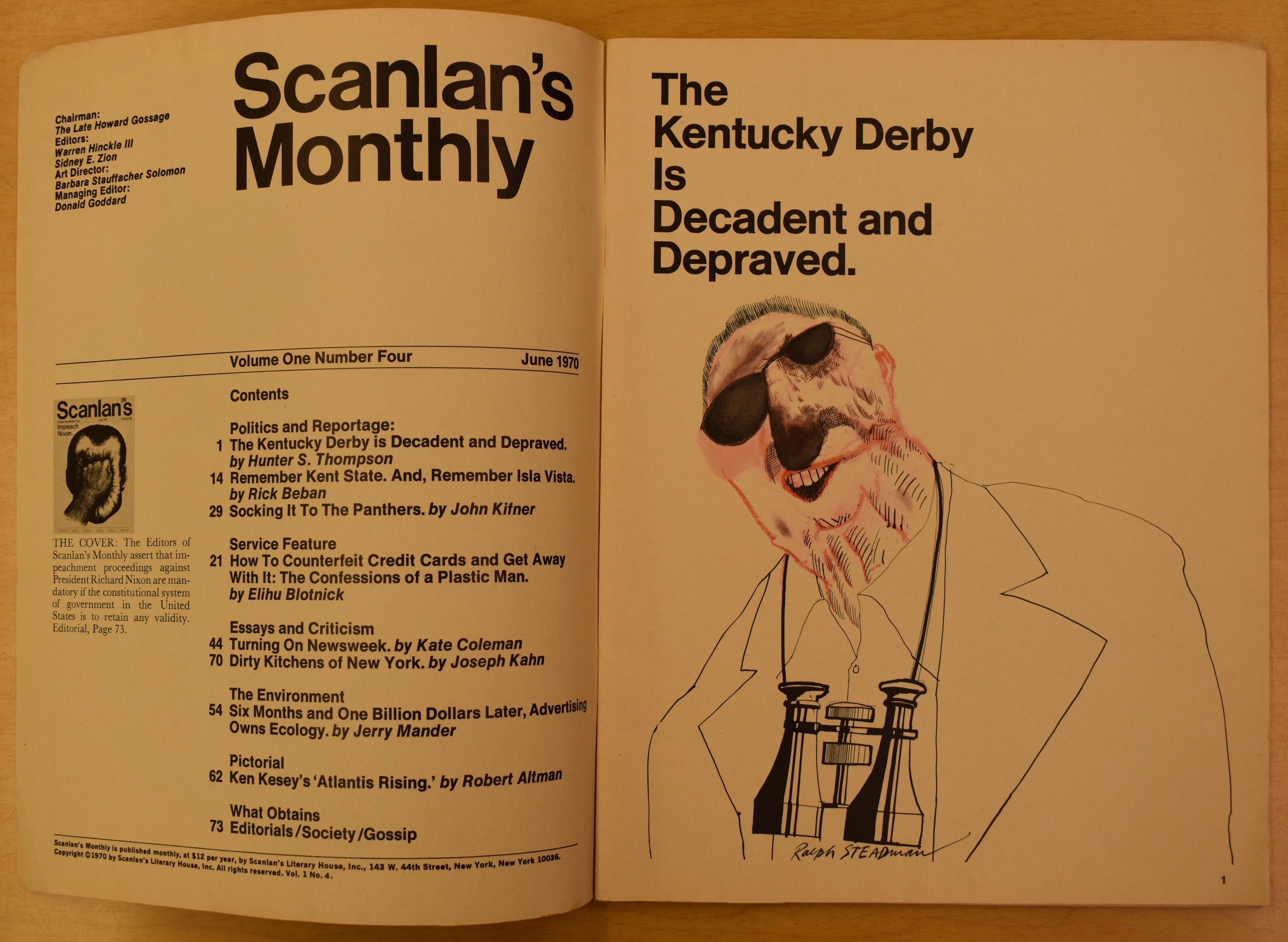 Thompson’s breakthrough in Gonzo journalism, “The Kentucky Derby Is Decadent and Depraved,” appeared in Scanlan’s magazine in June 1970.