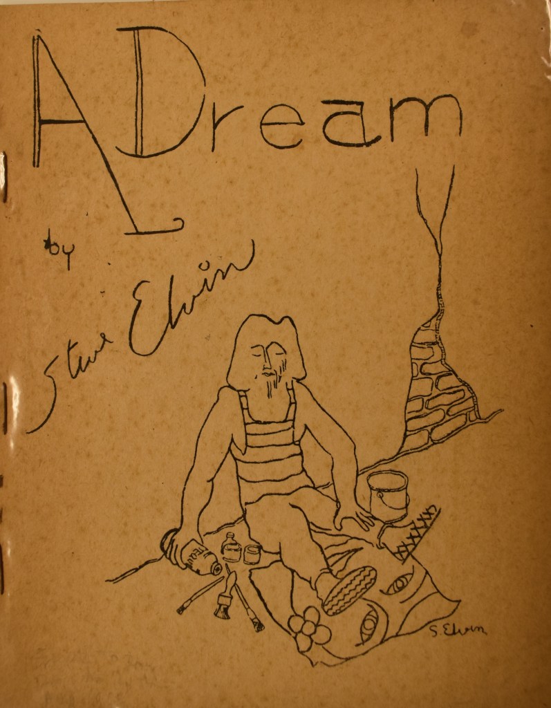Steve Elvin, the original artist of the cyclopean owl closely associated with Thompson and named on the title page of the fair-copy typescript from April 1971, produced this chapbook of poems in Mexico in 1967. So far as I can tell, it may be the only copy left in existence.