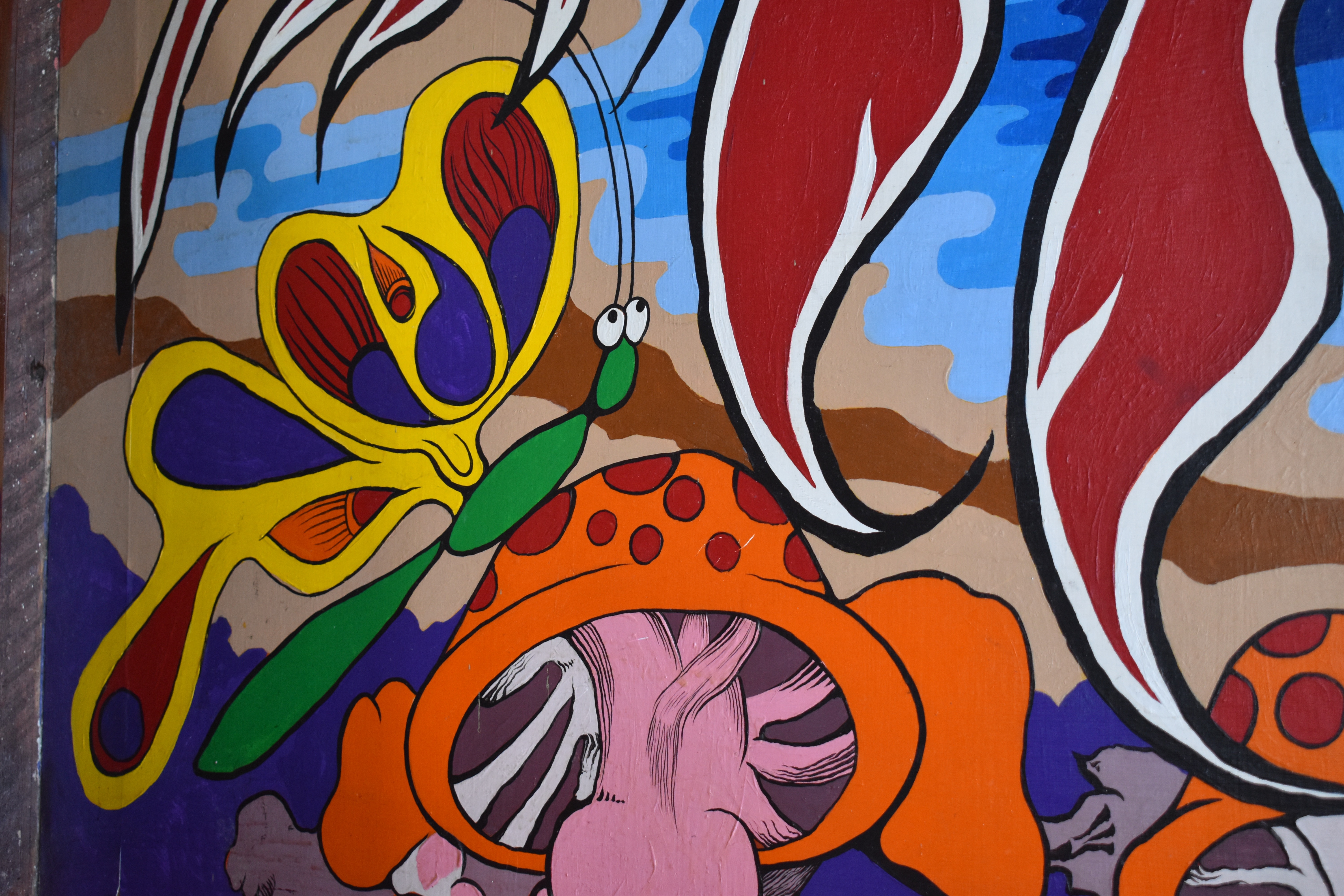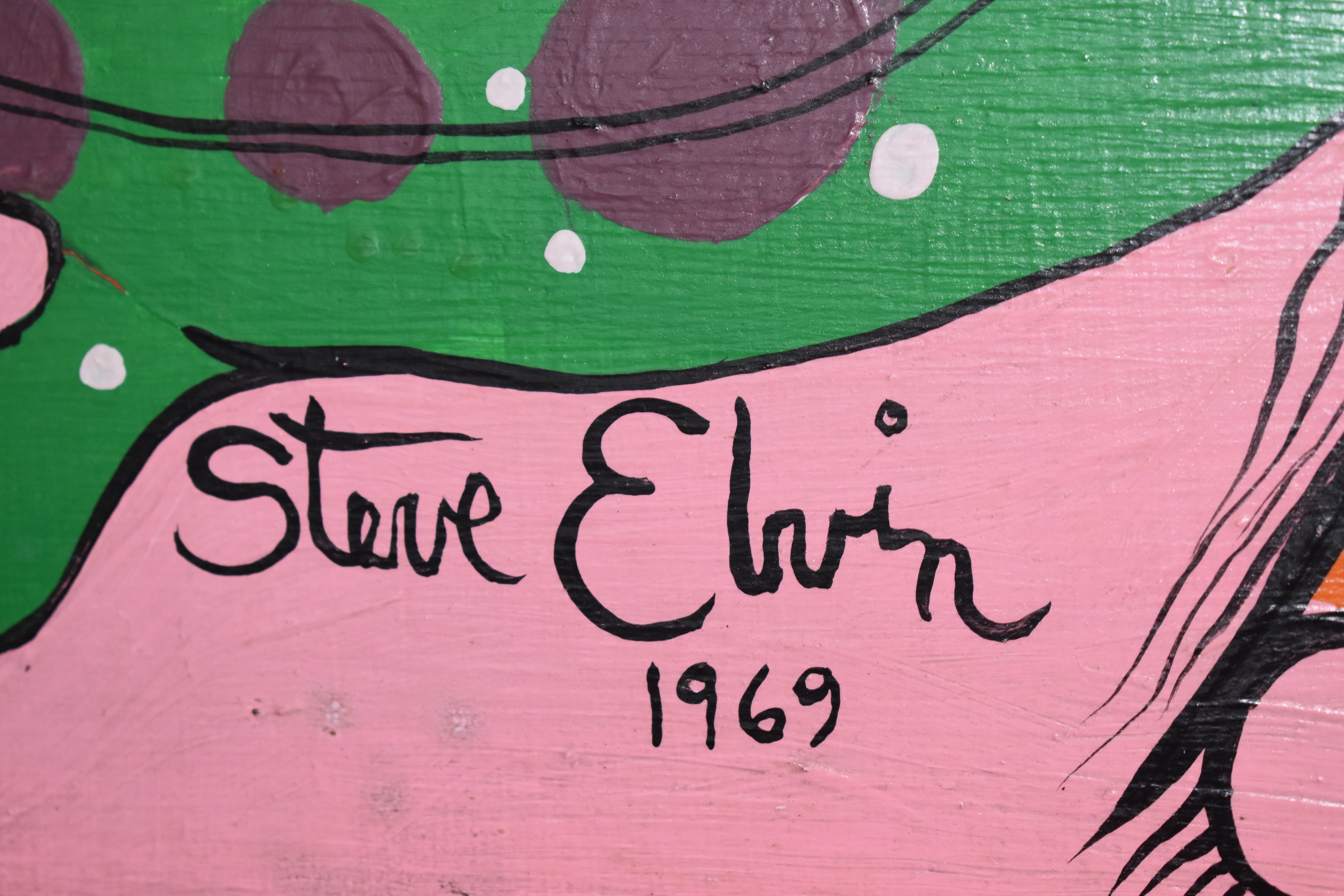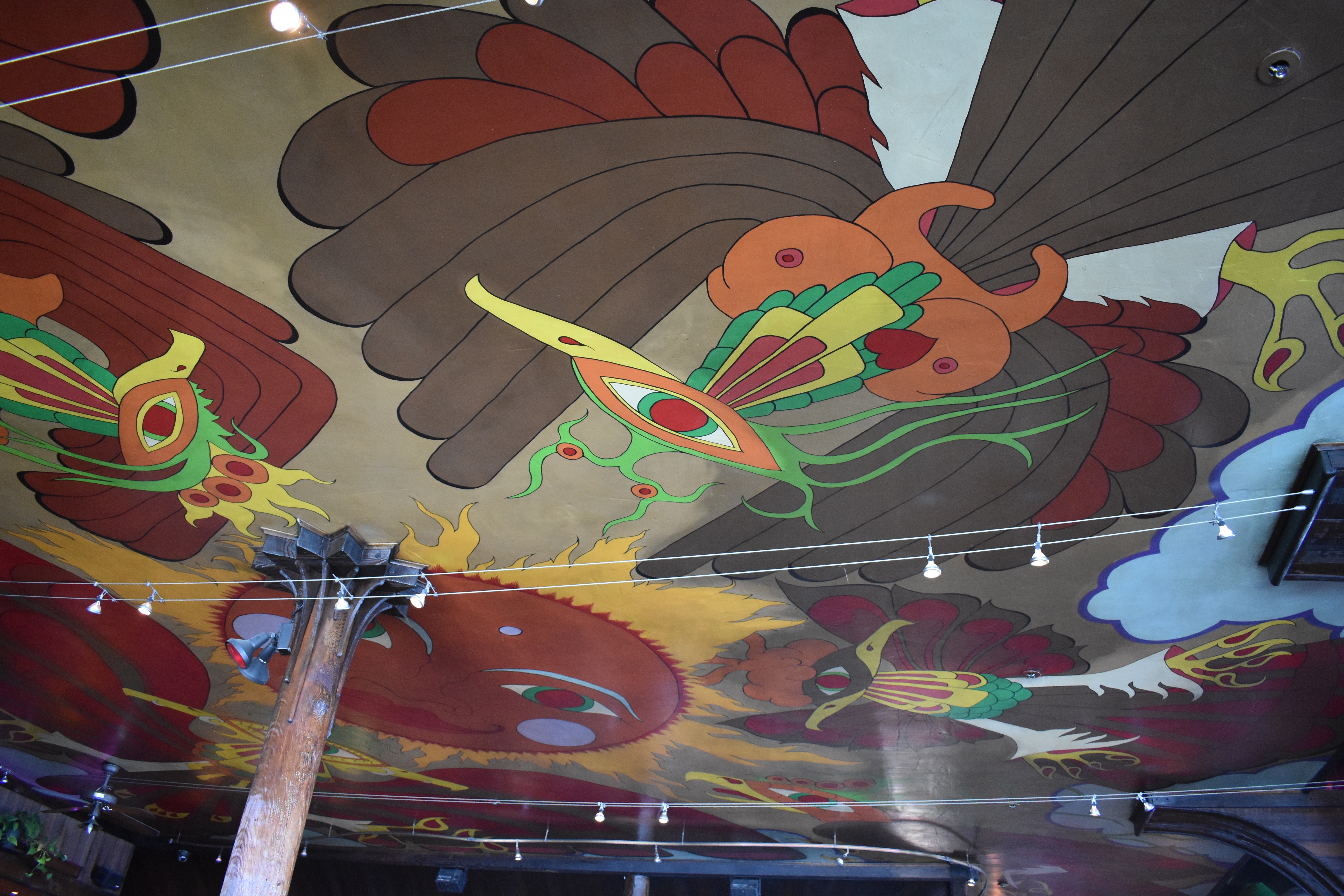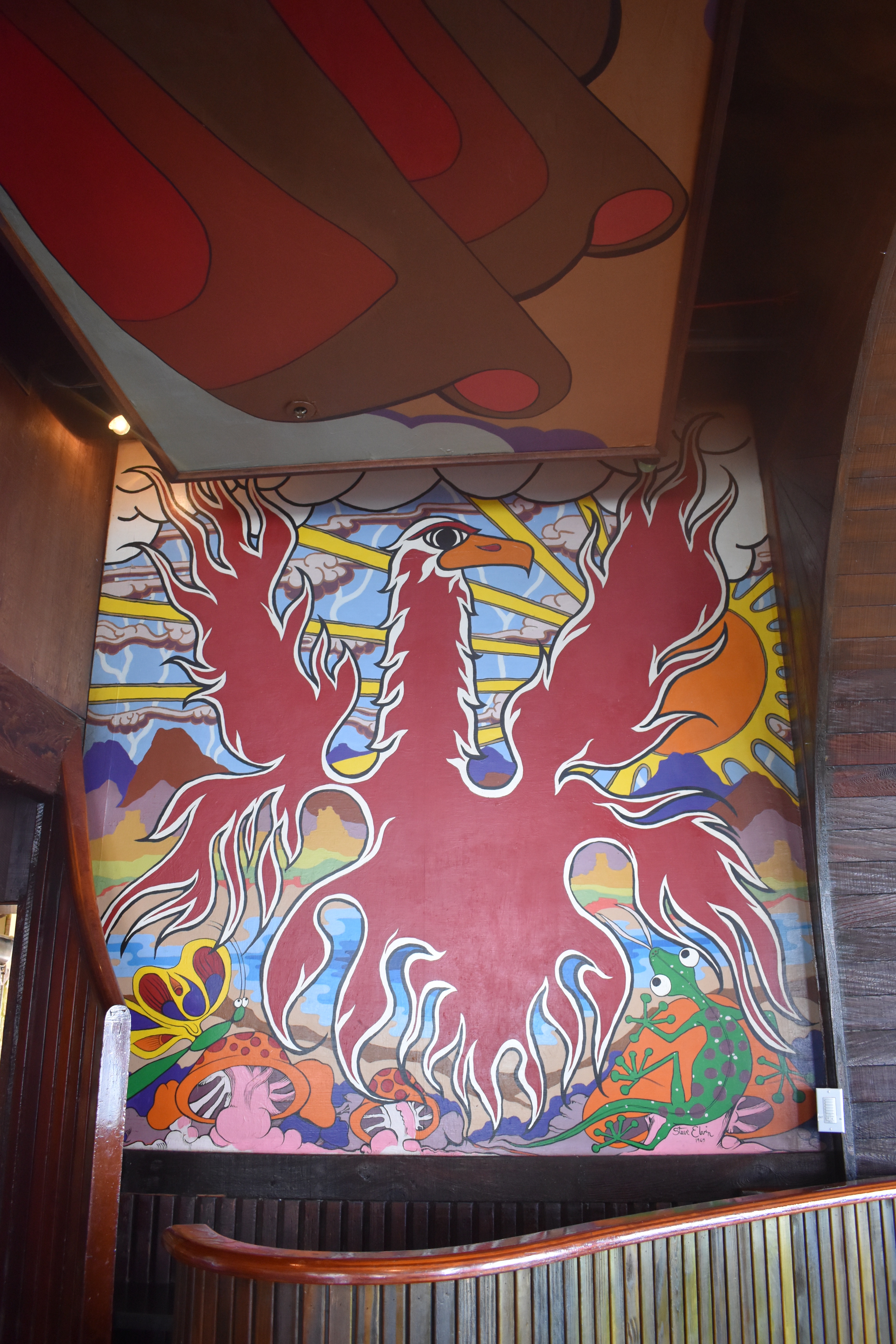 Steve Elvin painted the ceiling and portions of the walls of The Trident restaurant in Sausalito in 1969. The mural remains in excellent condition as of 2021.