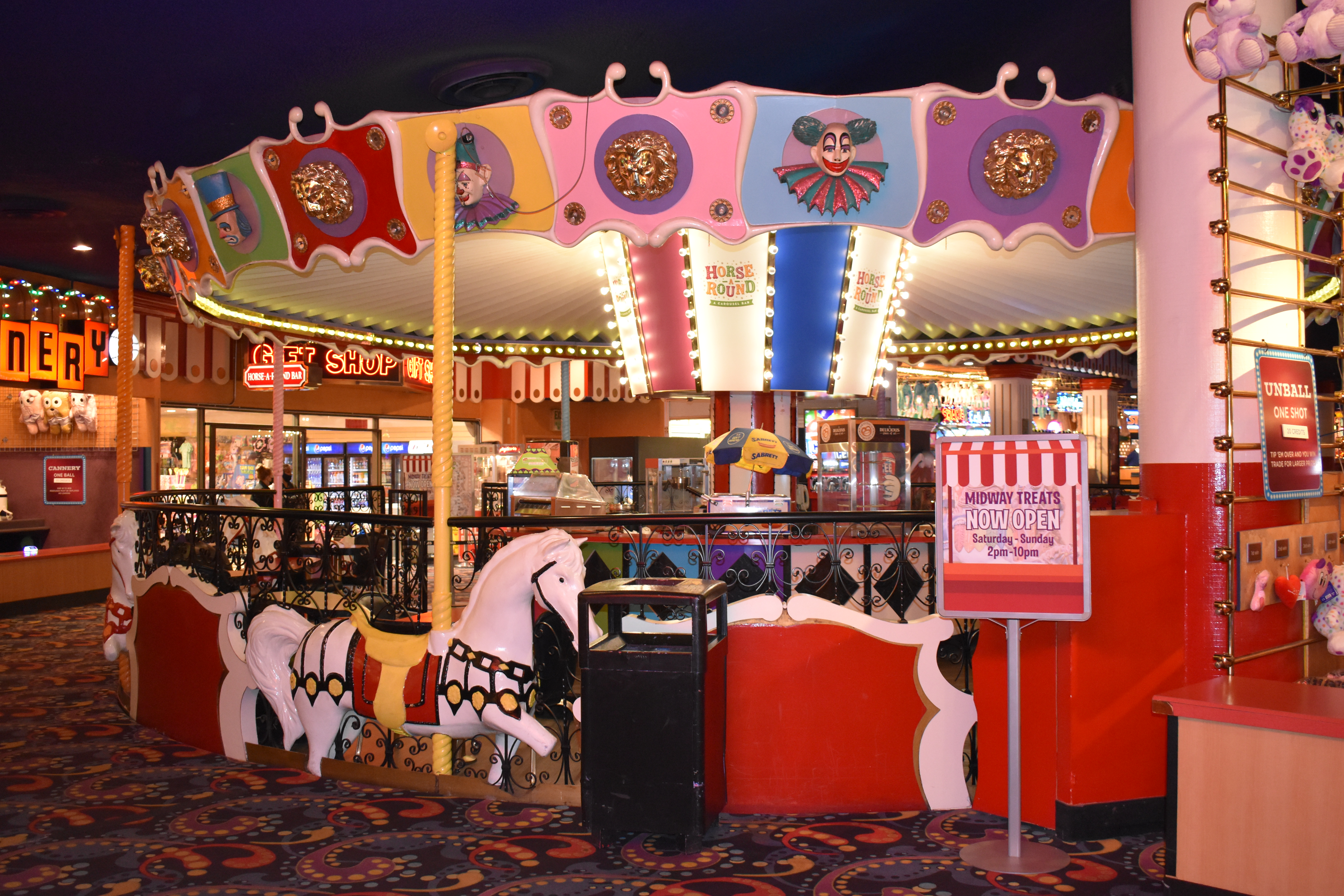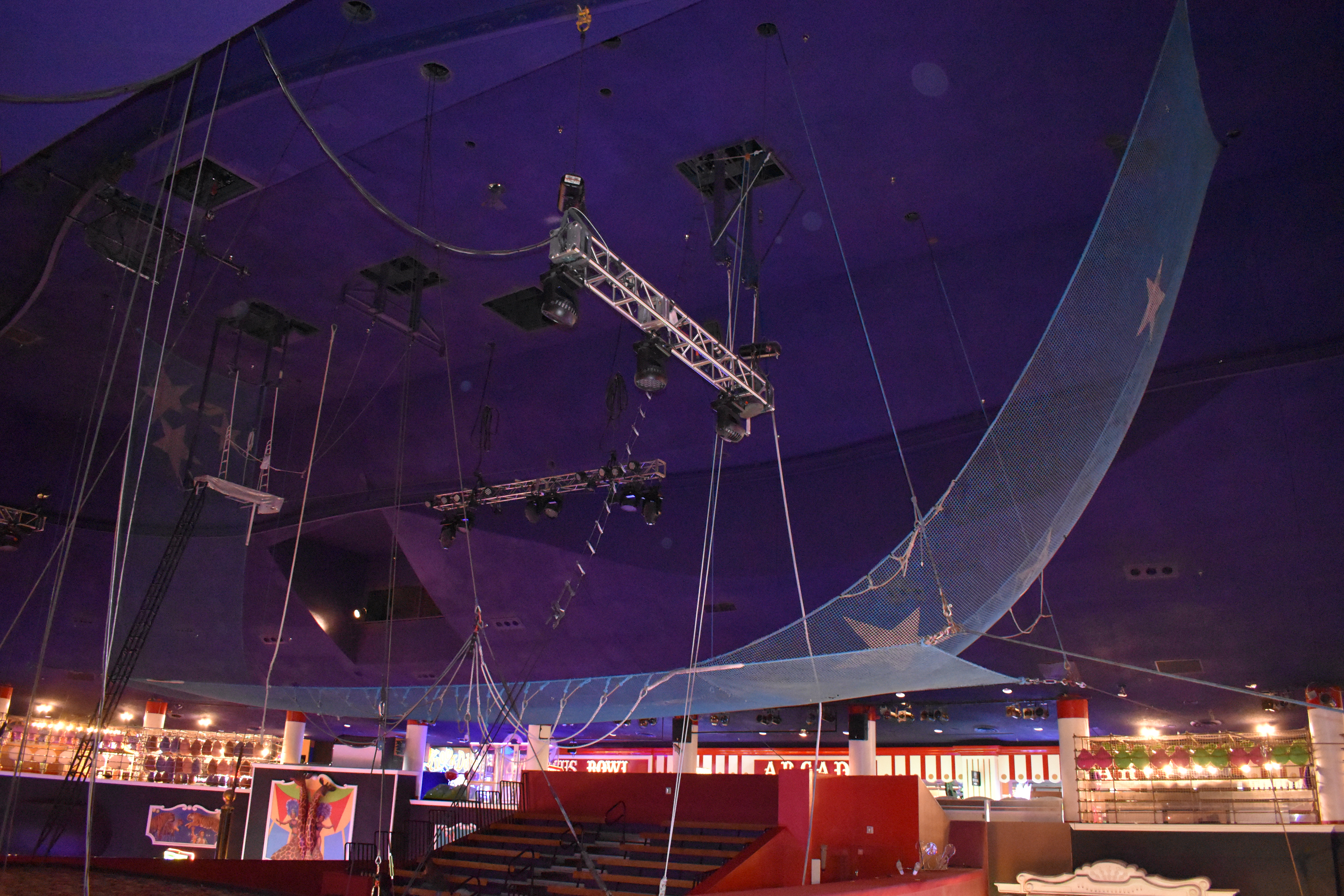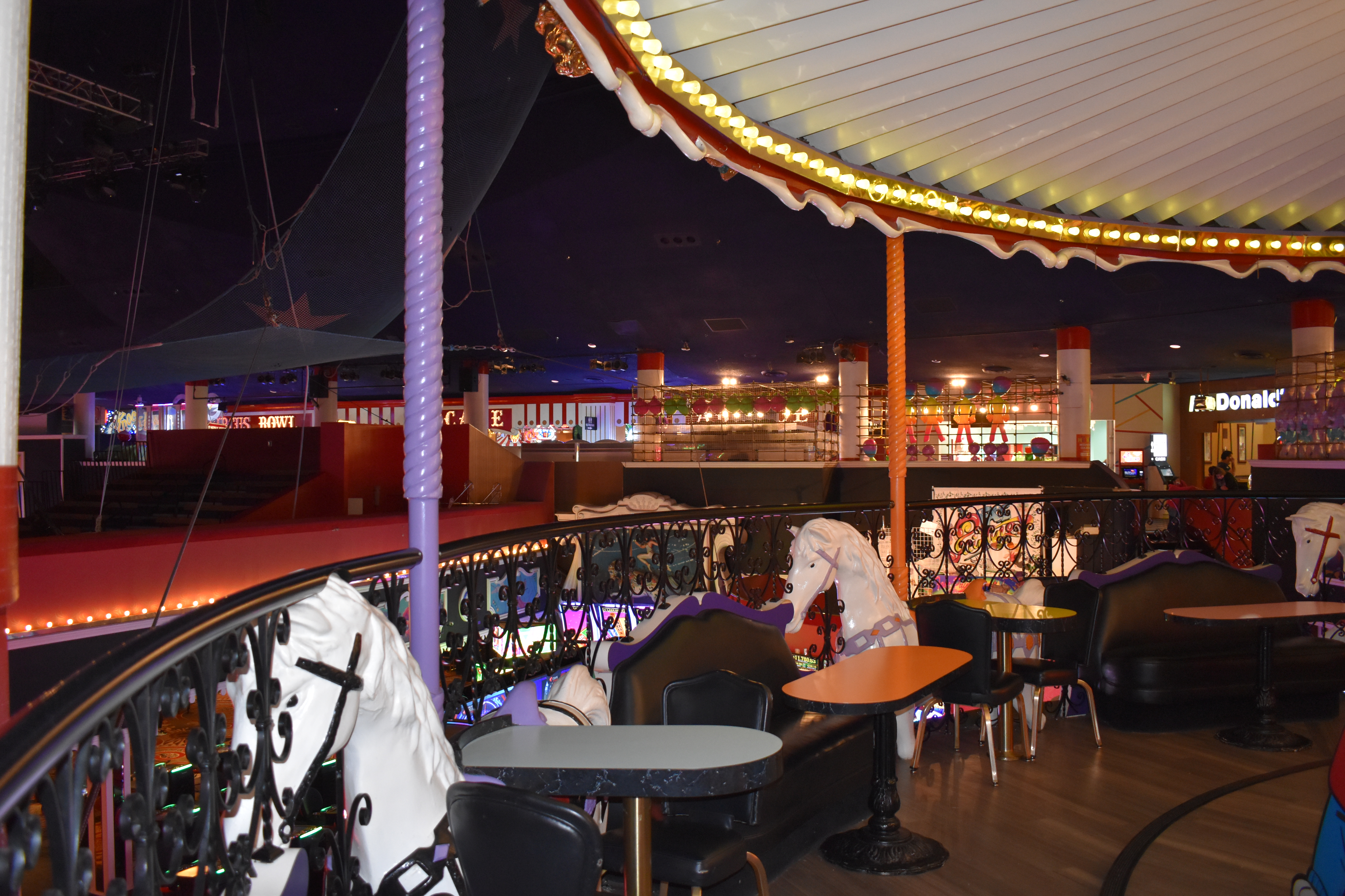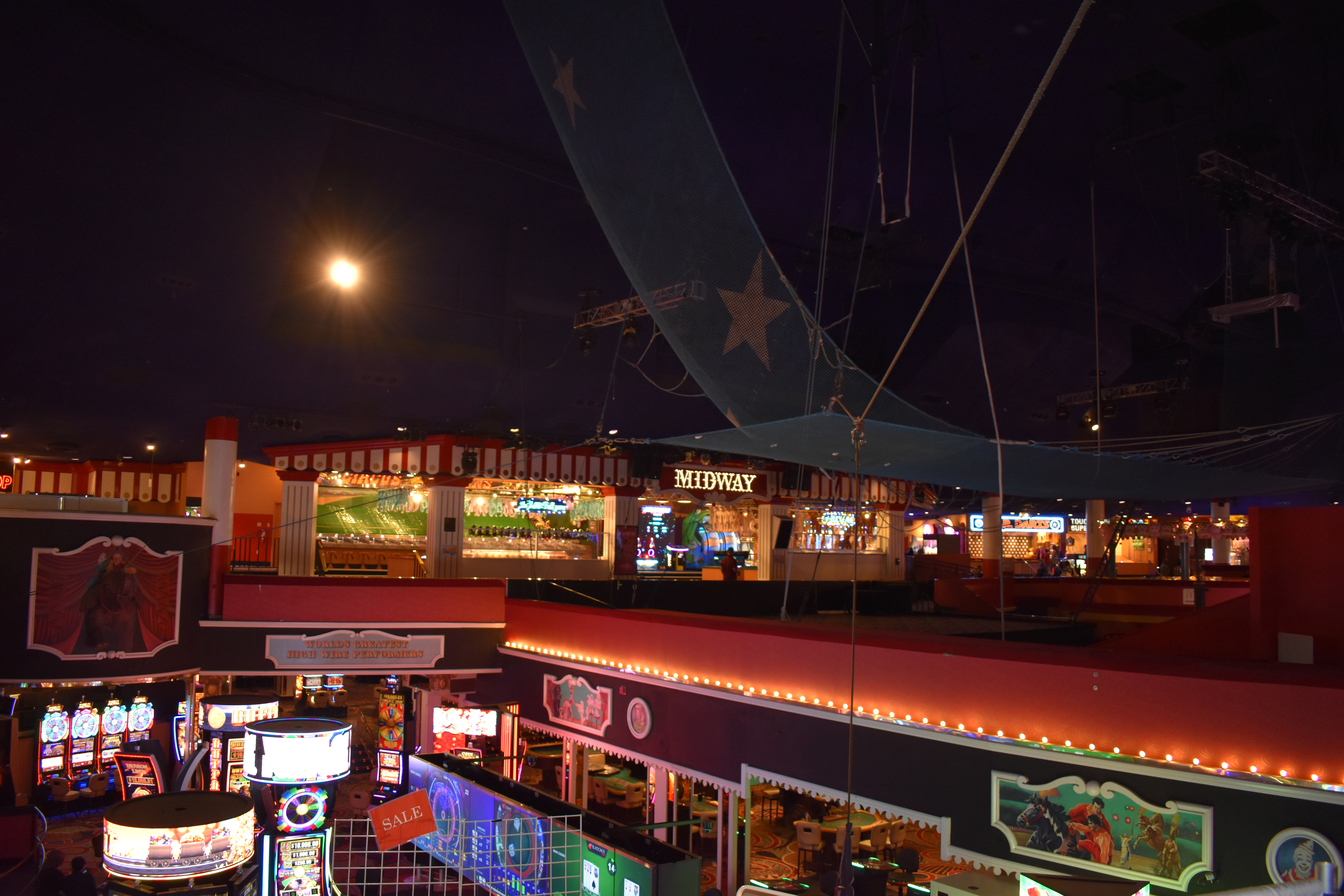 The midway and the carousel bar overlooking the gambling floor all still exist, though the carousel bar no longer turns and now serves treats instead of alcohol. The vaulted ceiling over the Midway Stage still features circus acts and acrobatic performances.